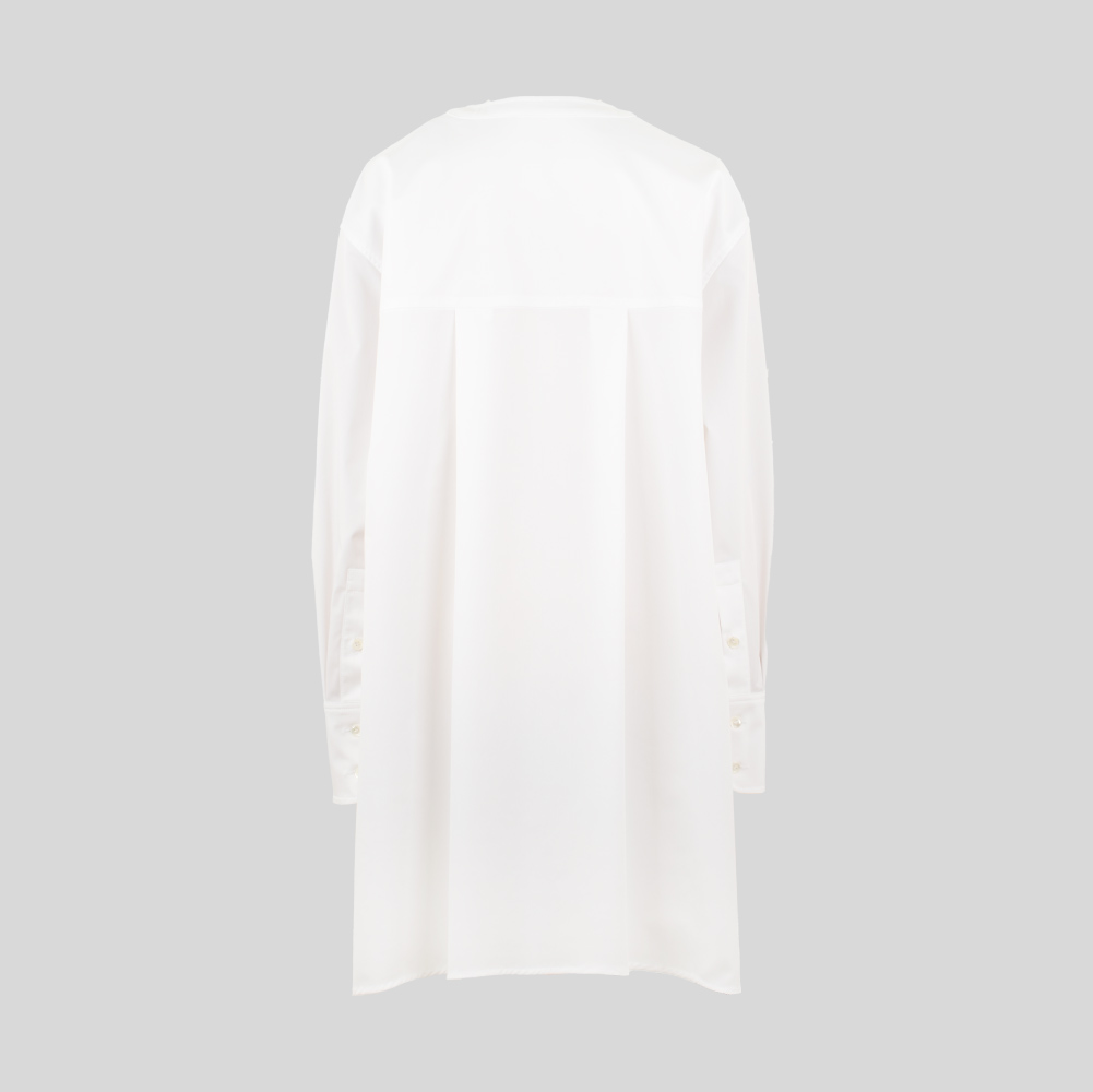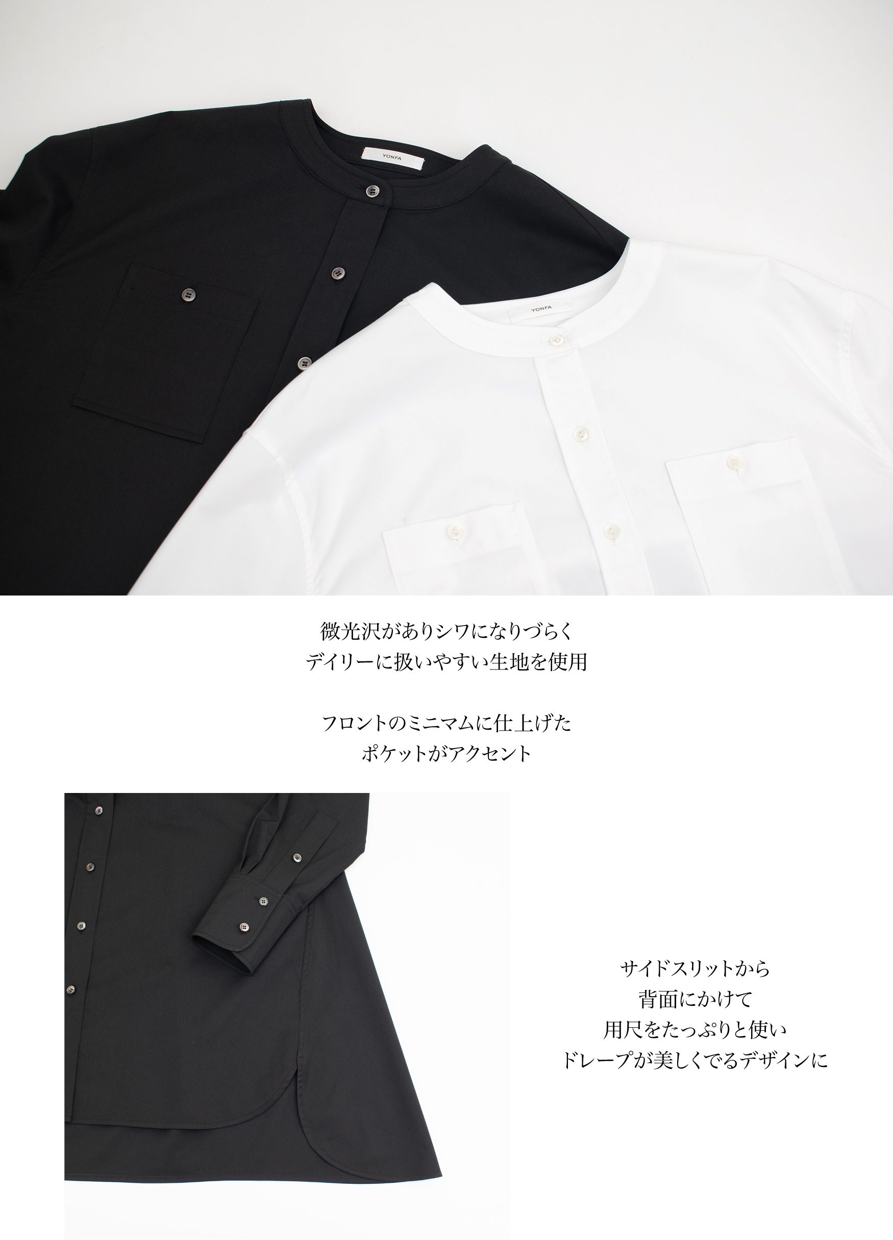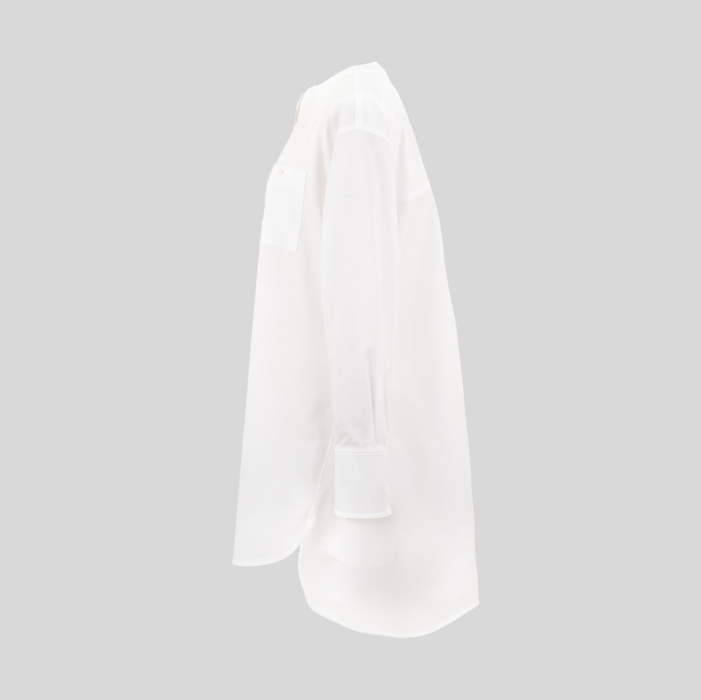 ラウンドカラーにフロントのキッチュなポケットが遊び心のあるシャツ。裾の両サイドにはラッフルをあしらいスタンダードな中にもデザイン性がありシンプルに着映えのするデザインシャツです。パンツとの合わせはもちろん、シャツドレスとしてもお楽しみいただけます。