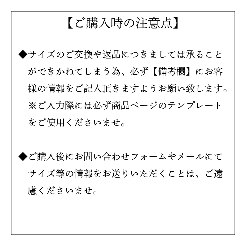 ※ご購入時の【備考欄】にサイズ等の情報を必ずご記入いただきますようお願いいたします。
