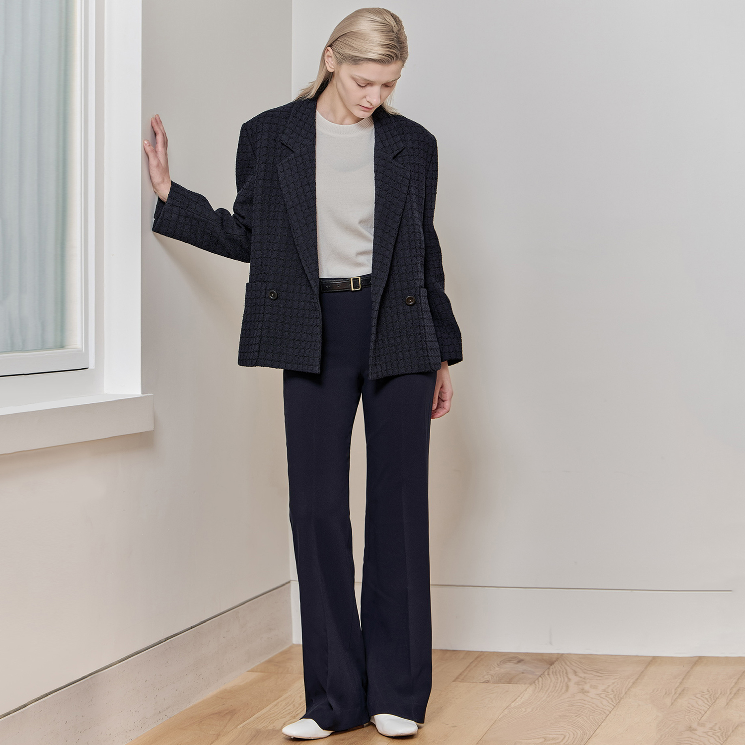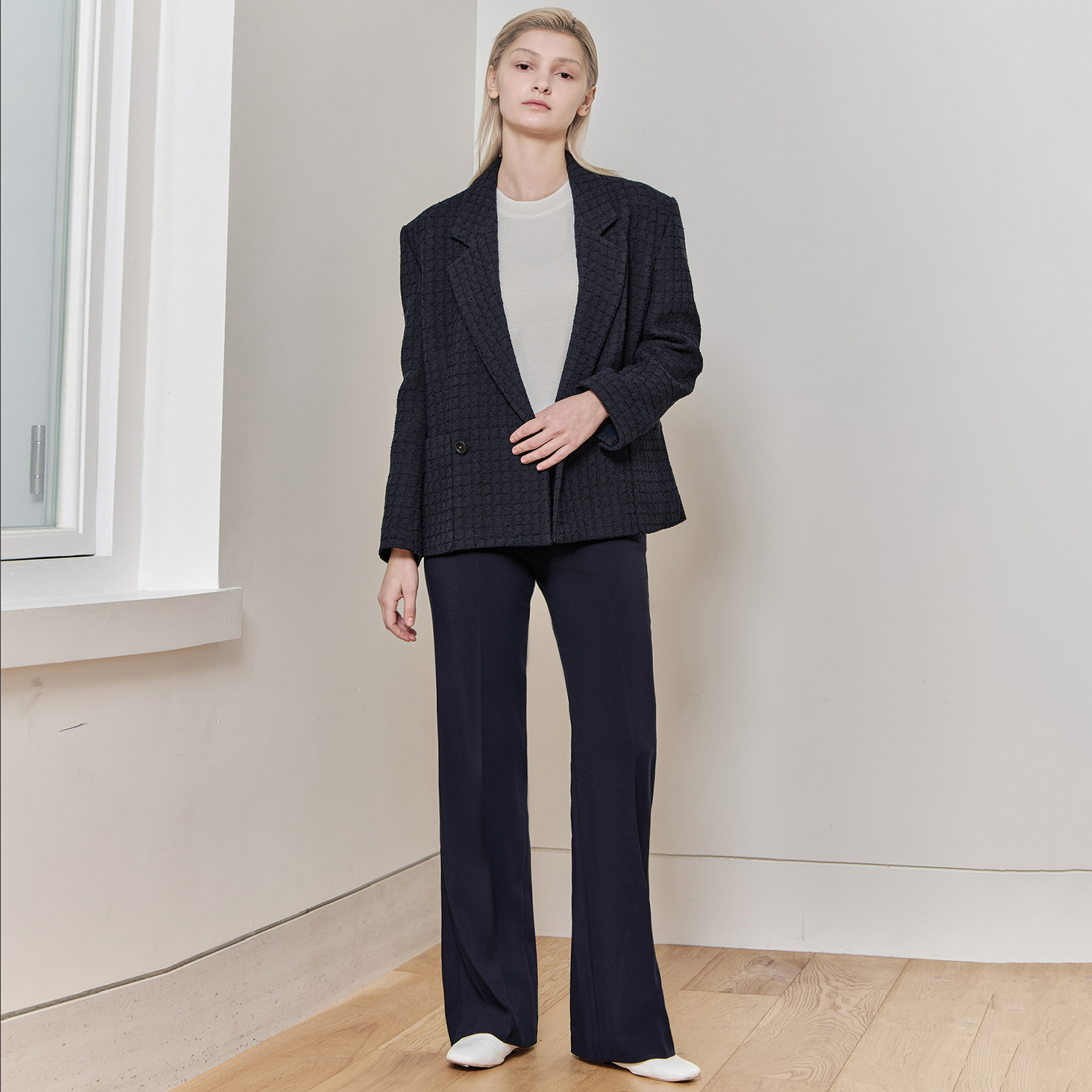 一目惚れした生地はnavy地にblackのチェック柄。シックでモダンな中に立体感があり美しい。胴回りはボックス型で全体的に程よいオーバーサイズに仕上げました。着用した時に首からショルダーラインが美しいL字を描くようにショルダーパッドをin。単品使いはもちろん、スラックスやスカート、ワンピースなどとの合わせも素敵で、オケージョンにもお使いいただけます。華やかなツイードだからこそ締めと抜けのバランスを意識してデザインを構成。生地、フォルム、ビッグポケット、襟、ボタン...静かな華やかさが香る格好の良いジャケットに仕上がりました。
