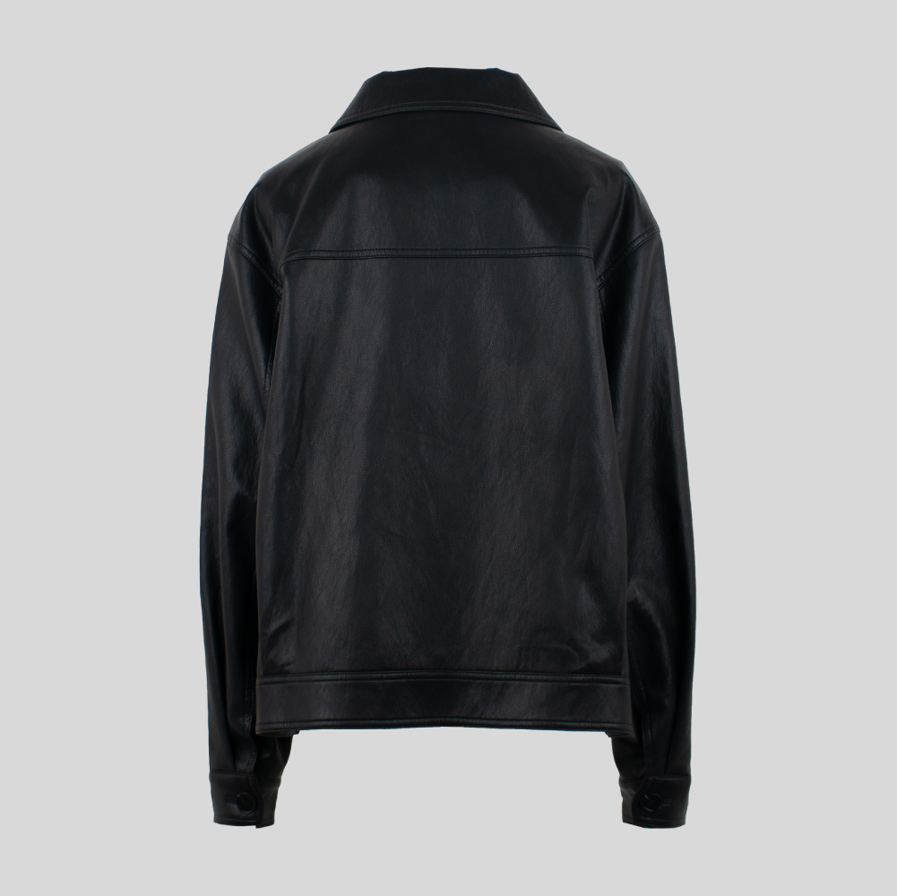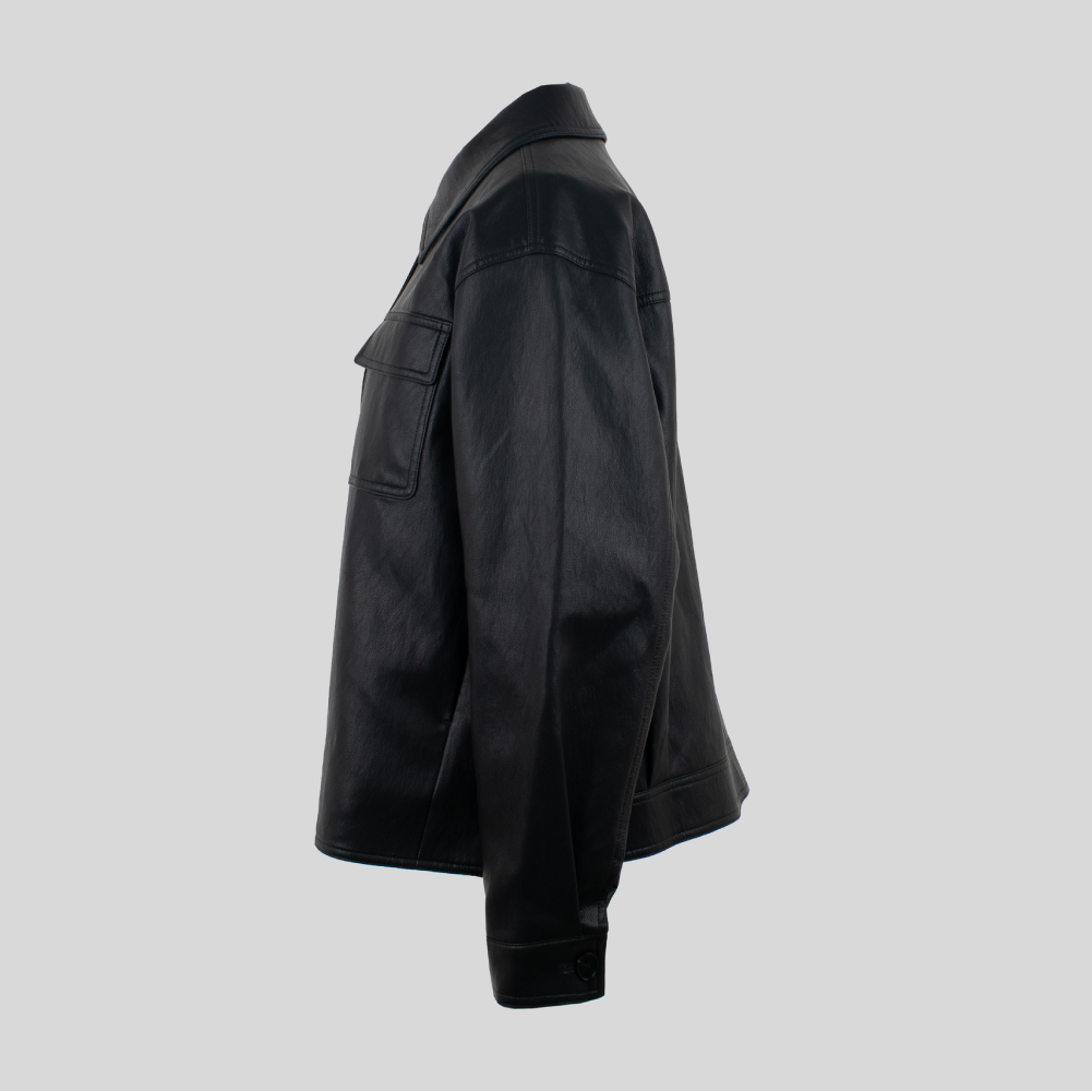 どんなスタイリングにも合わせやすいシンプルさの中に、YONFAらしさを散りばめた"Lジャケット"。ecoレザーを使用したジャケットです。拘り抜いたフォルムはボックス型のオーバーサイズで、背面の裾に施したタックが立体感を演出します。襟とビッグサイズに仕上げた胸元のポケットがポイントとなりカッコよくお召しいただける一着です。