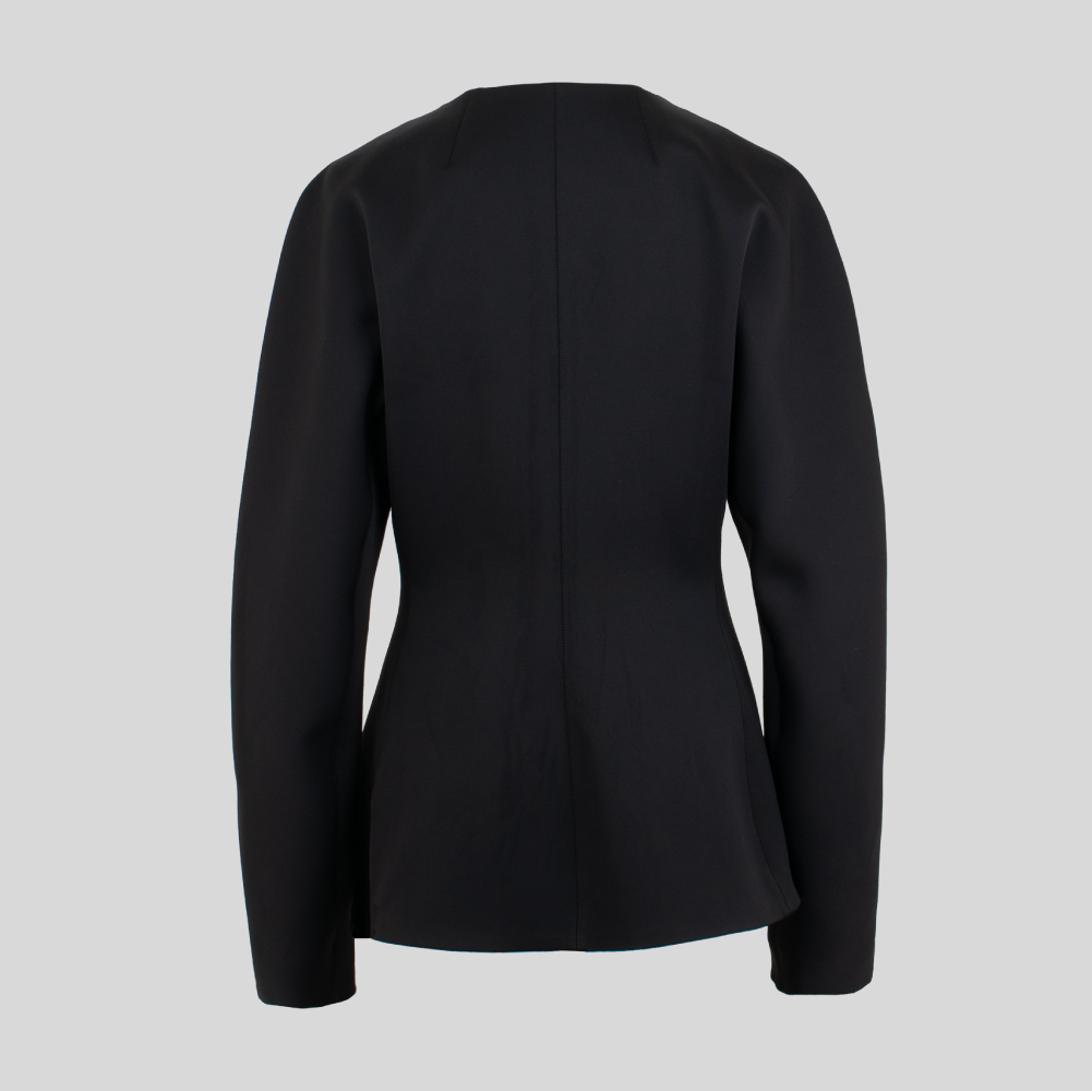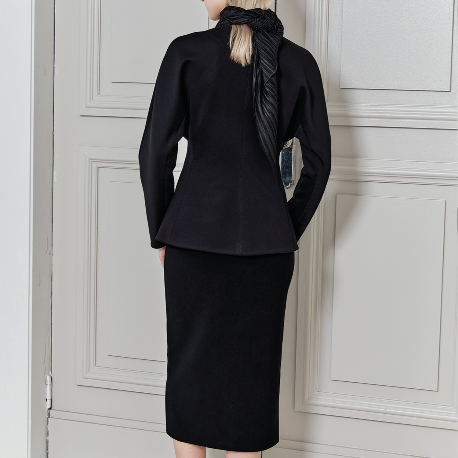 ウエストはシェイプし、バックスタイルに入る裾のドレープが素敵です。