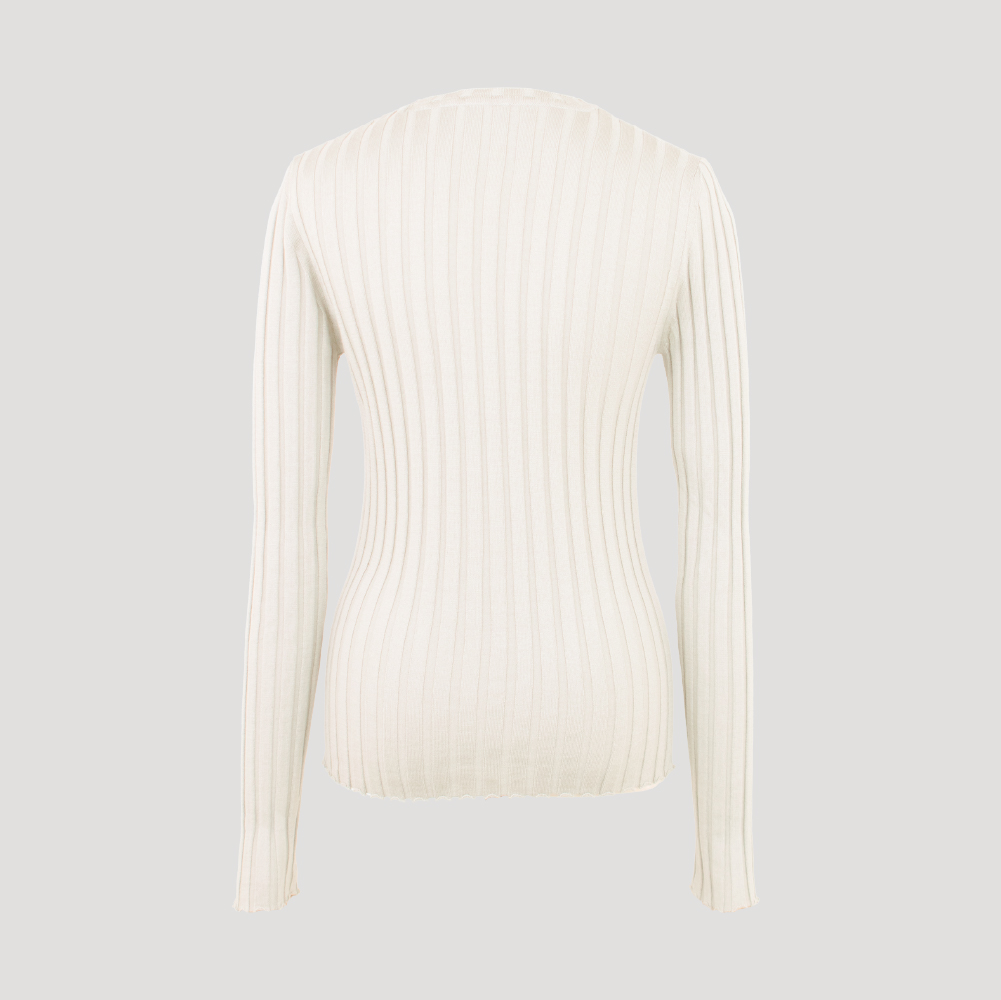 カシミヤを配合した微光沢が美しい贅沢なデイリーウェア。畝が太いリブ編みで、袖口はデザインが生きるようウェーブに仕上げました。柔らかくしっとりした質感で着心地も良く、一枚ではもちろん、レイヤリングにも欠かせない一枚です。