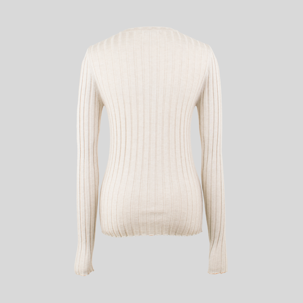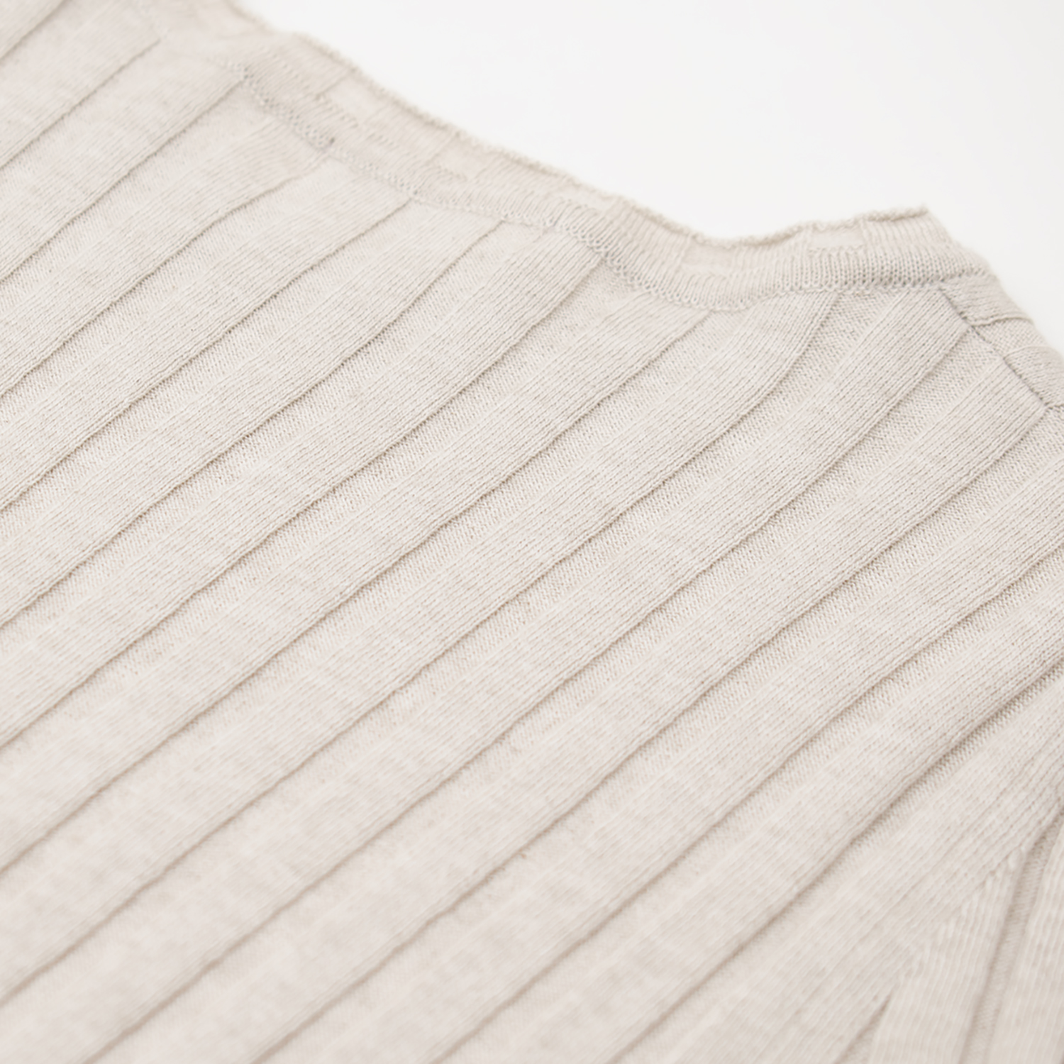 カシミヤを配合した微光沢が美しい贅沢なデイリーウェア。畝が太いリブ編みで、袖口はデザインが生きるようウェーブに仕上げました。柔らかくしっとりした質感で着心地も良く、一枚ではもちろん、レイヤリングにも欠かせない一枚です。