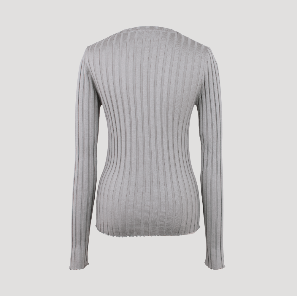 カシミヤを配合した微光沢が美しい贅沢なデイリーウェア。畝が太いリブ編みで、袖口はデザインが生きるようウェーブに仕上げました。柔らかくしっとりした質感で着心地も良く、一枚ではもちろん、レイヤリングにも欠かせない一枚です。