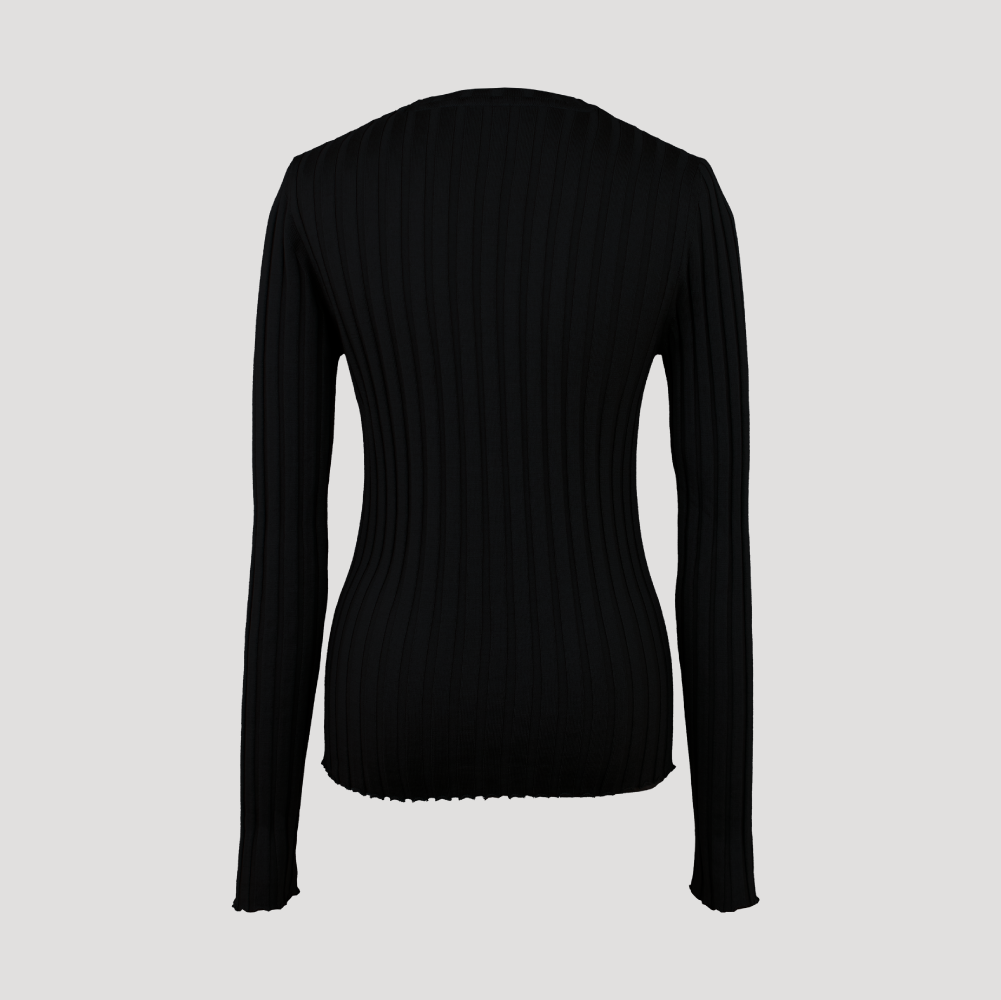 カシミヤを配合した微光沢が美しい贅沢なデイリーウェア。畝が太いリブ編みで、袖口はデザインが生きるようウェーブに仕上げました。柔らかくしっとりした質感で着心地も良く、一枚ではもちろん、レイヤリングにも欠かせない一枚です。