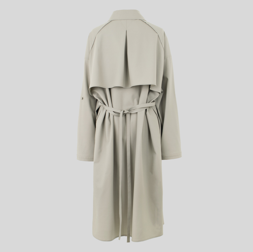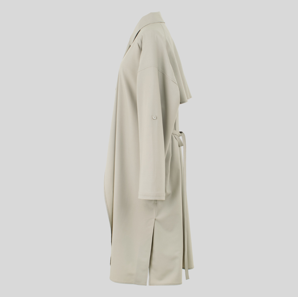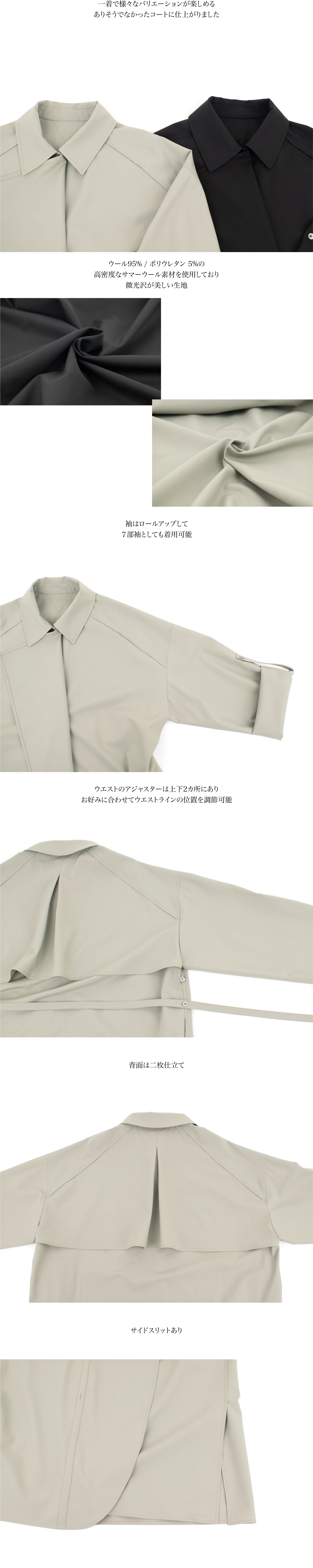 ウール95%のサマーウール素材は微光沢が美しく薄手ながらに高密度でハリコシがあり美しい落ち感があります。全体的にオーバーフィットでドロップショルダーで仕上げたことで肩周りもノンストレスな着用感。前身頃は全て閉めてウエストベルトを止める事で生まれるシャープさやモード感。生地とデザインのバランスはなんとも言えない雰囲気を作り出しありそうでなかったコートに仕上がりました。これからのシーズン肩の力を抜きいつものコーディネートに、またフォーマルな場にも自信を持って着用可能な一着です。