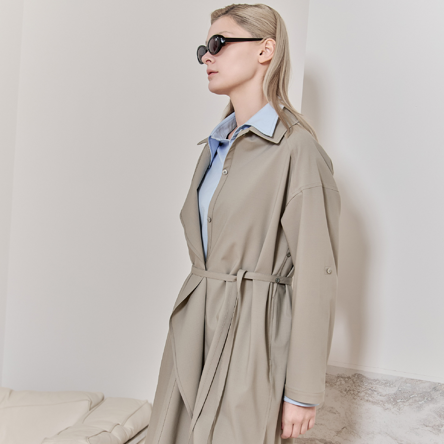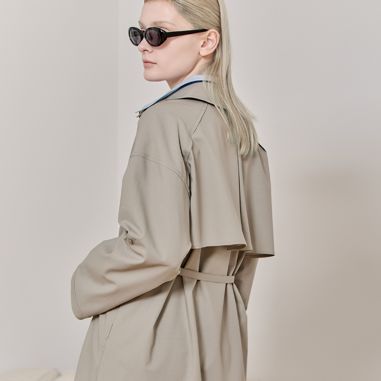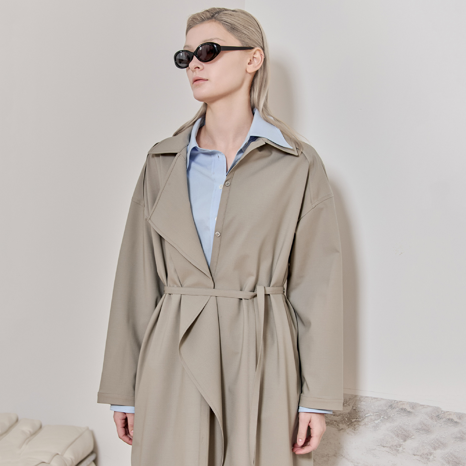 ウール95%のサマーウール素材は微光沢が美しく薄手ながらに高密度でハリコシがあり美しい落ち感があります。全体的にオーバーフィットでドロップショルダーで仕上げたことで肩周りもノンストレスな着用感。前身頃は全て閉めてウエストベルトを止める事で生まれるシャープさやモード感。生地とデザインのバランスはなんとも言えない雰囲気を作り出しありそうでなかったコートに仕上がりました。これからのシーズン肩の力を抜きいつものコーディネートに、またフォーマルな場にも自信を持って着用可能な一着です。