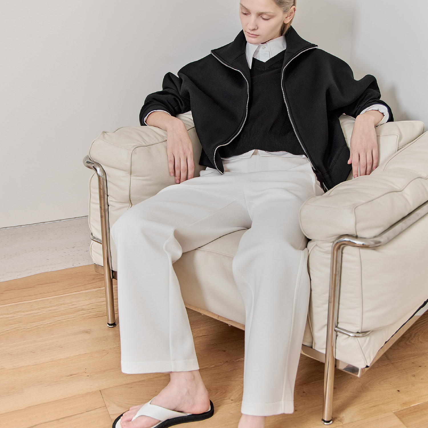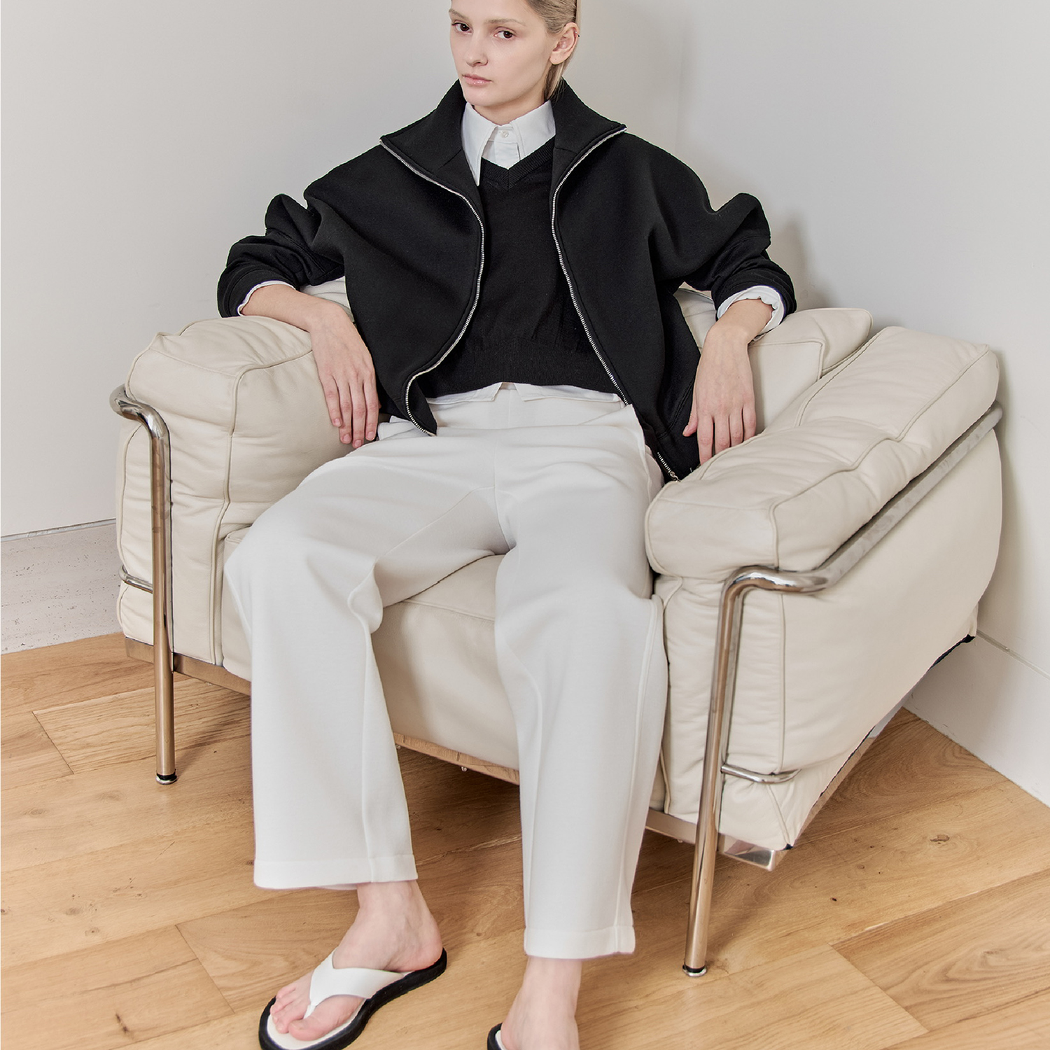 胴回り、アームはルーズなシルエットながらコンパクトなフォルムに。ジップの開閉でハイネックとして、また襟付き、その日の気分で2通りお楽しみいただけます。フロントのジップは上下から開閉可能でコーディネートによりお好みでお楽しみ下さい。