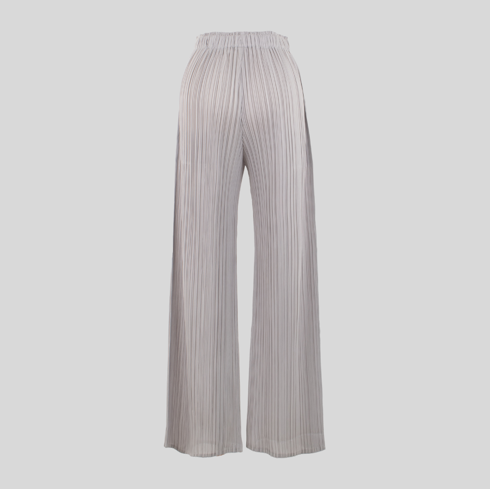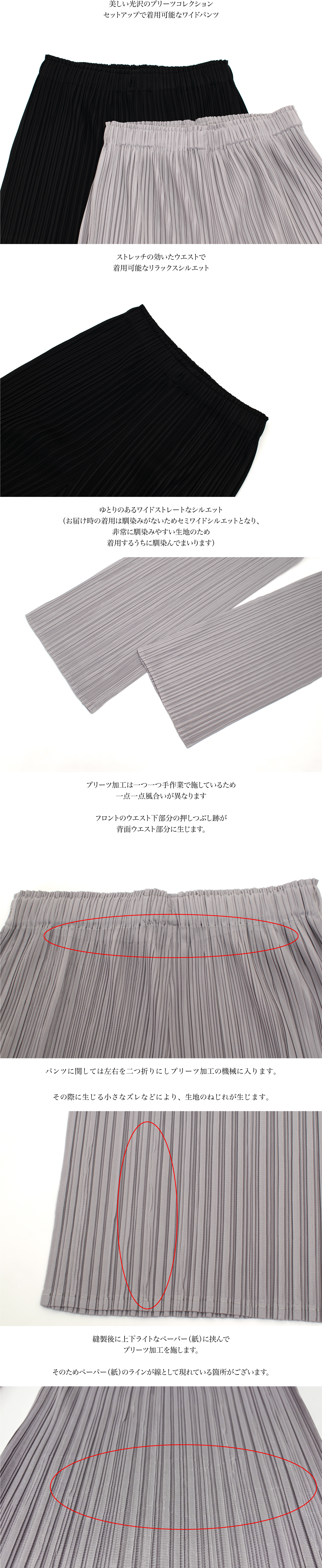 美しい光沢感のある生地にプリーツ加工を施し、シンプルなセミワイドシルエットに仕上げました。プリーツがボディラインをすっきりと美しく引き立てます。ウエストは全周ゴム仕様でデイリーから旅行まで幅広く活躍します。